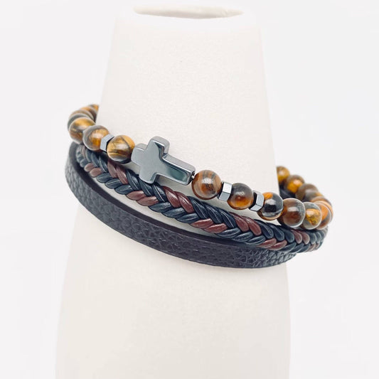 Cross Natural Stone Beaded Men's Leather Bracelet - Coffee Yellow Tiger Stone -
