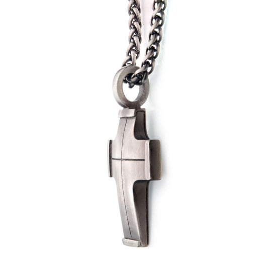 Gun Metal Plated Cross Pendant with Steel Wheat Chain