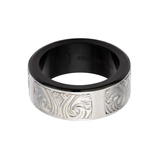 Black IP Steel Scroll Pattern Ring