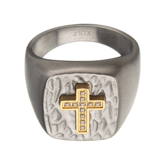 Gold IP Cross with Clear CZs on Steel Hammered Signet Rings