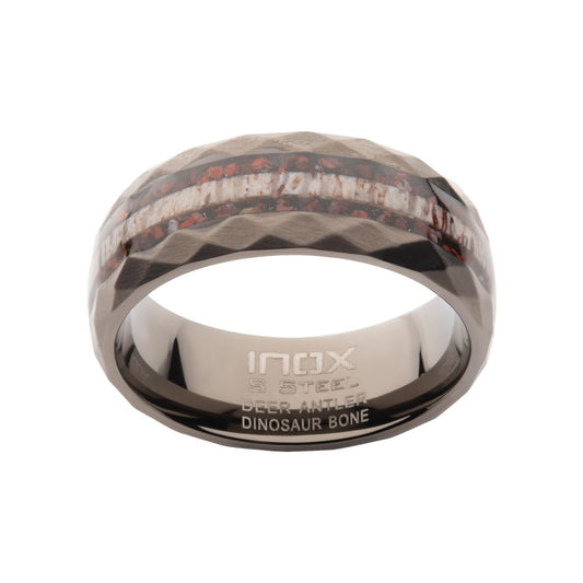 Gun Metal IP Steel Matte Finish Dinosaur Bone & Deer Antler Inlay Comfort Fit Ring