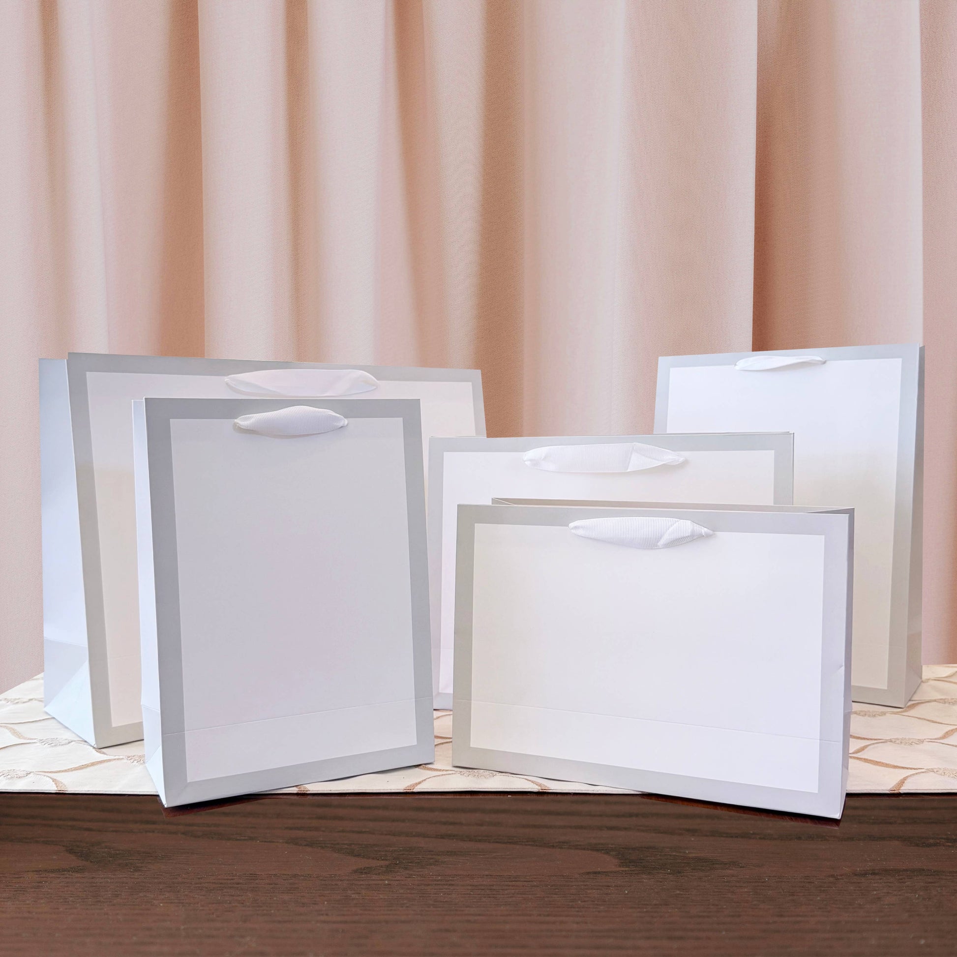 These stylish gift bags feature a soft pastel gray border and gusset, adding a touch of charm and elegance to your packaging. Each set includes free tissue paper, making it easy to present your products beautifully—perfect for retail, boutiques, and upscale gifting.