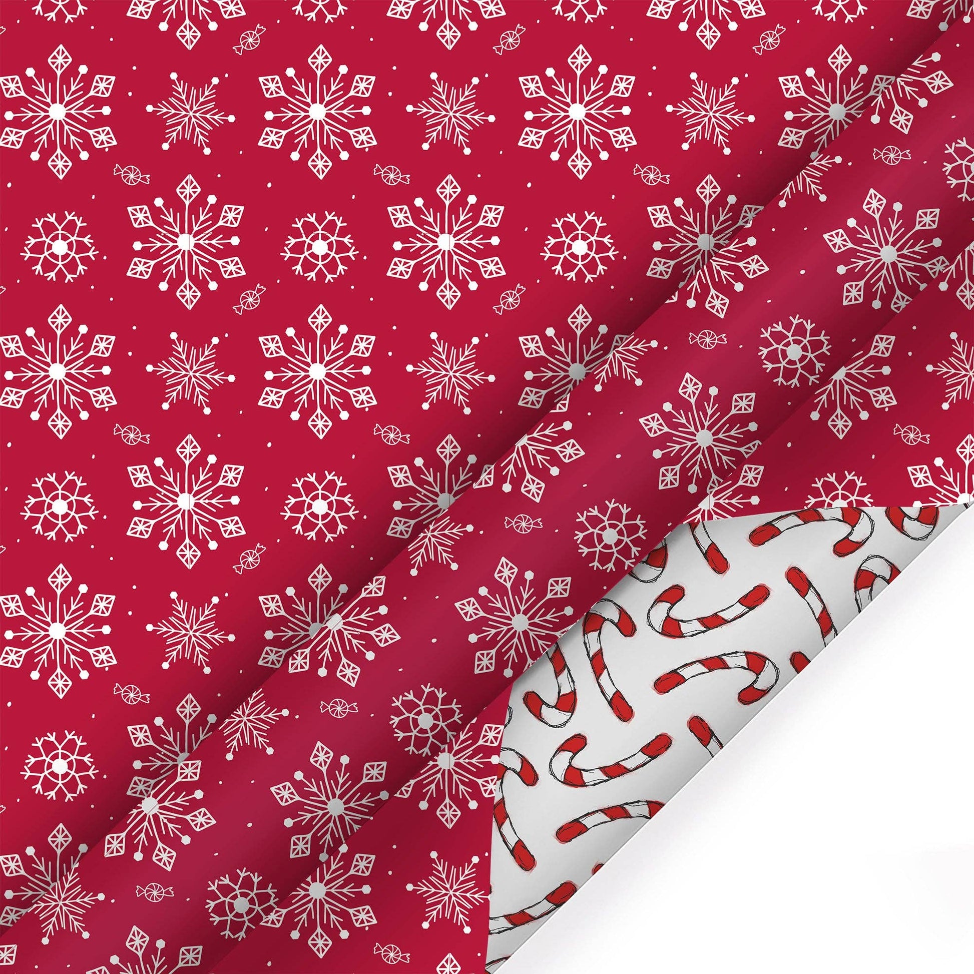 * Dual-Sided Design: This holiday wrapping paper features a reversible pattern with elegant white snowflakes on a red background on one side and festive candy canes on the other.