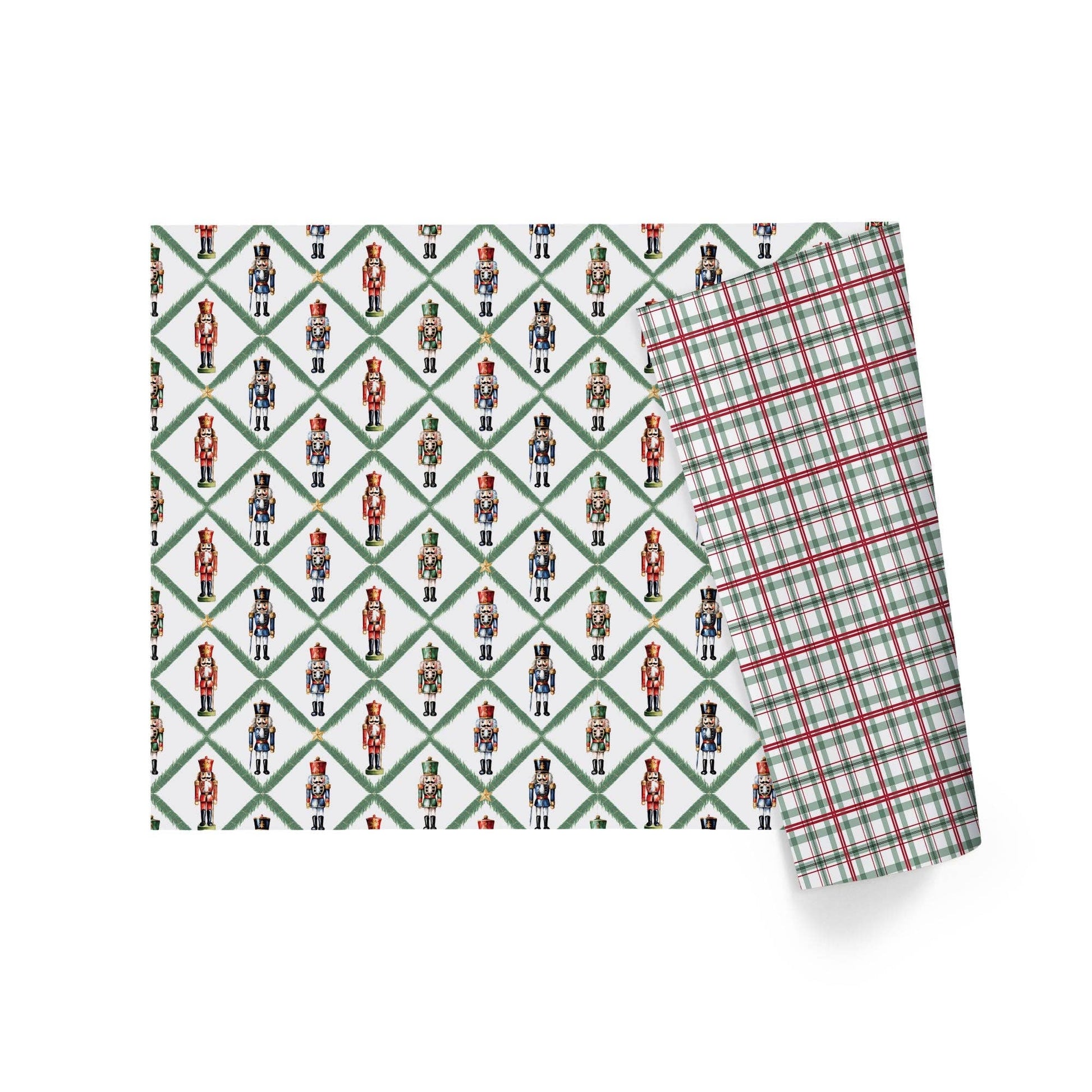 30" x 10' Reversible Holiday Wrapping Paper | Norfolk Pine Nutcracker/Small Red and Green Plaid