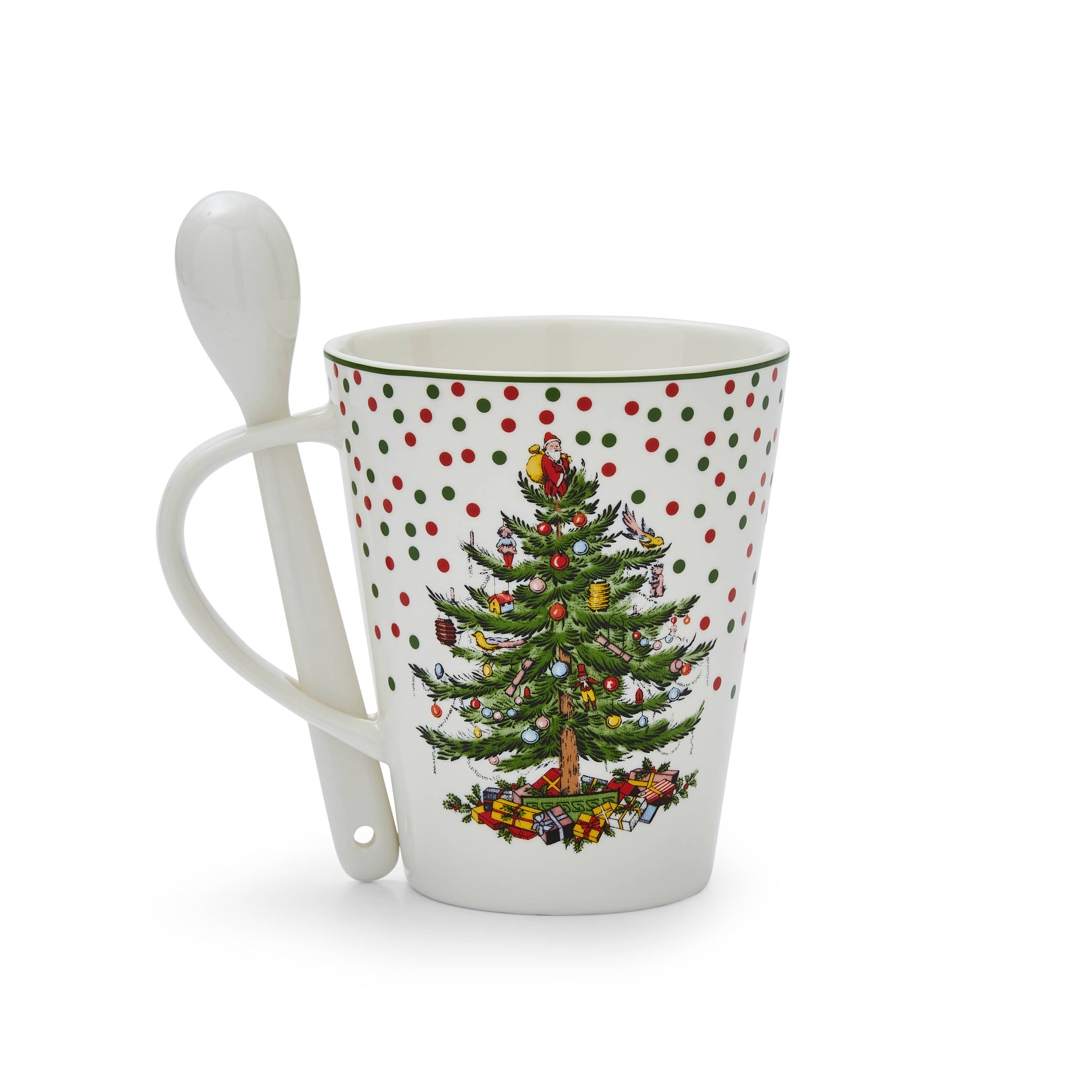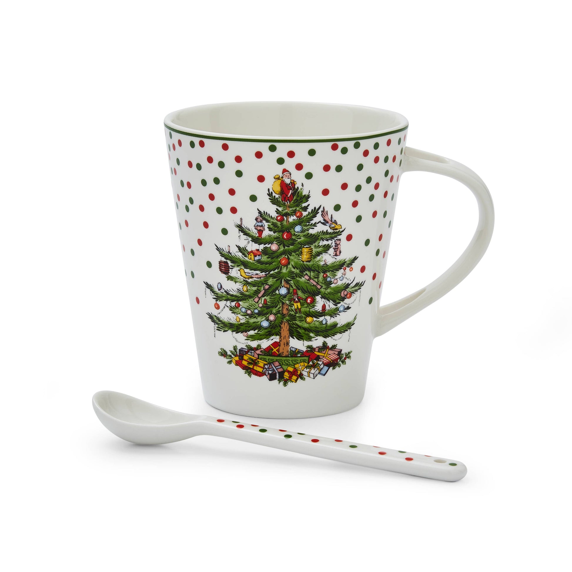 Perfect for hot cocoa, this Christmas Tree Polka Dot Mug and Spoon set includes a generous 14 ounce mug featuring the iconic Spode Christmas Tree motif surrounded by a shower of green and red polka dots. A coordinating spoon that sits in the handle makes this a treat for holiday gifting.