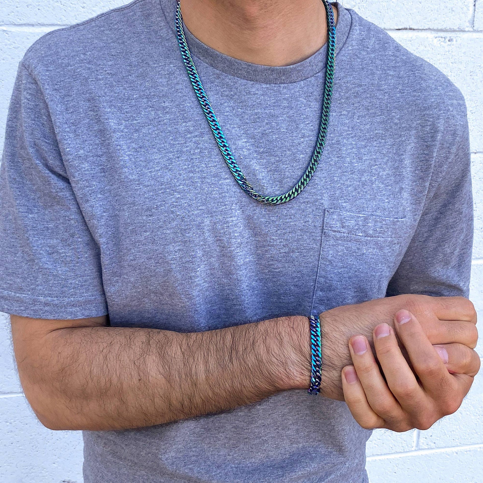 This high polished curb chain bracelet has a solid stainless steel curb link chain construction. The solid metal construction gives this item a nice weight for the perfect feel and appeal. The bracelet construction yields maximum comfort, as the links contour well on to the shape of your wrist. This bracelet measures 8 1/4 inches long x 5/16 inches wide and secures with a Fold over clasp.