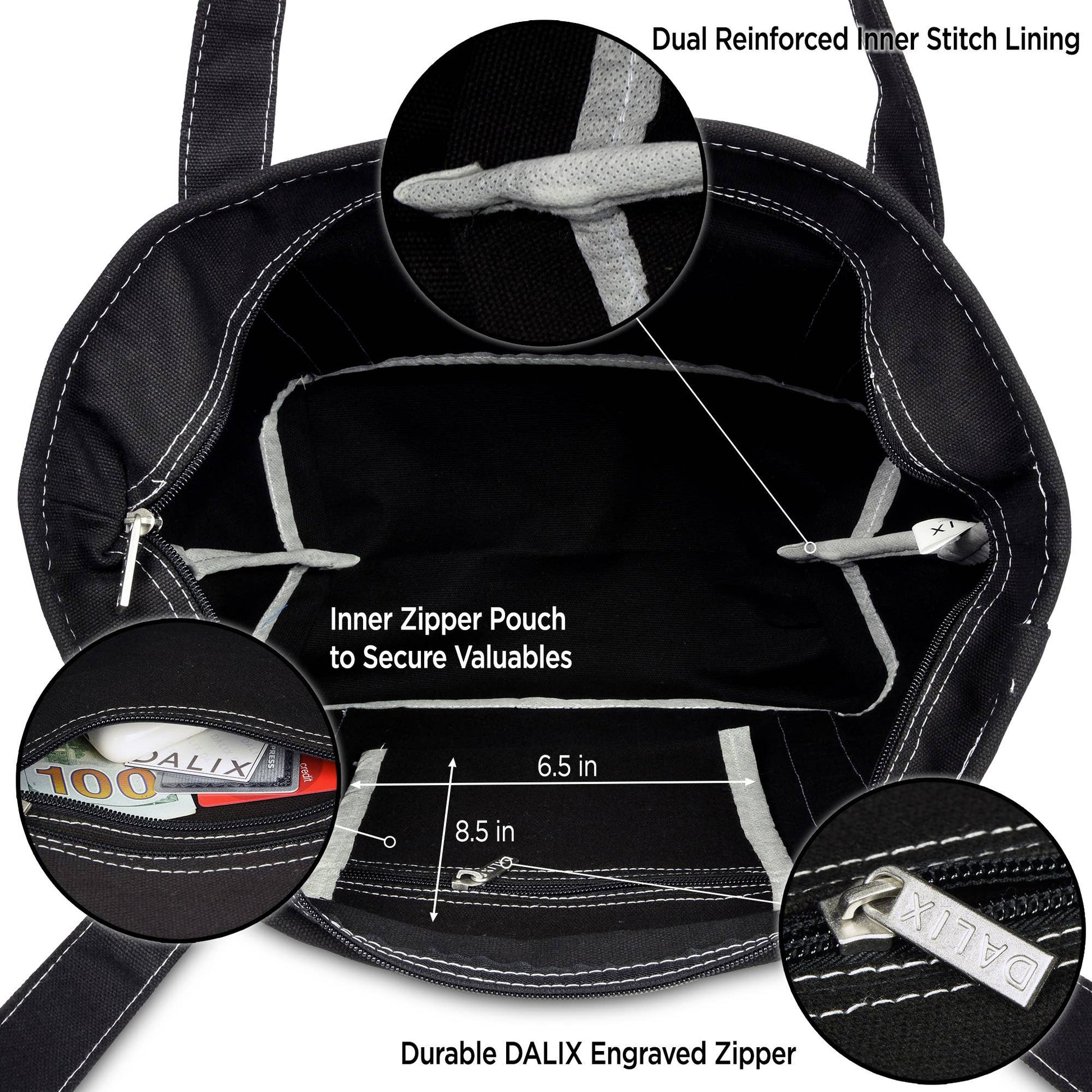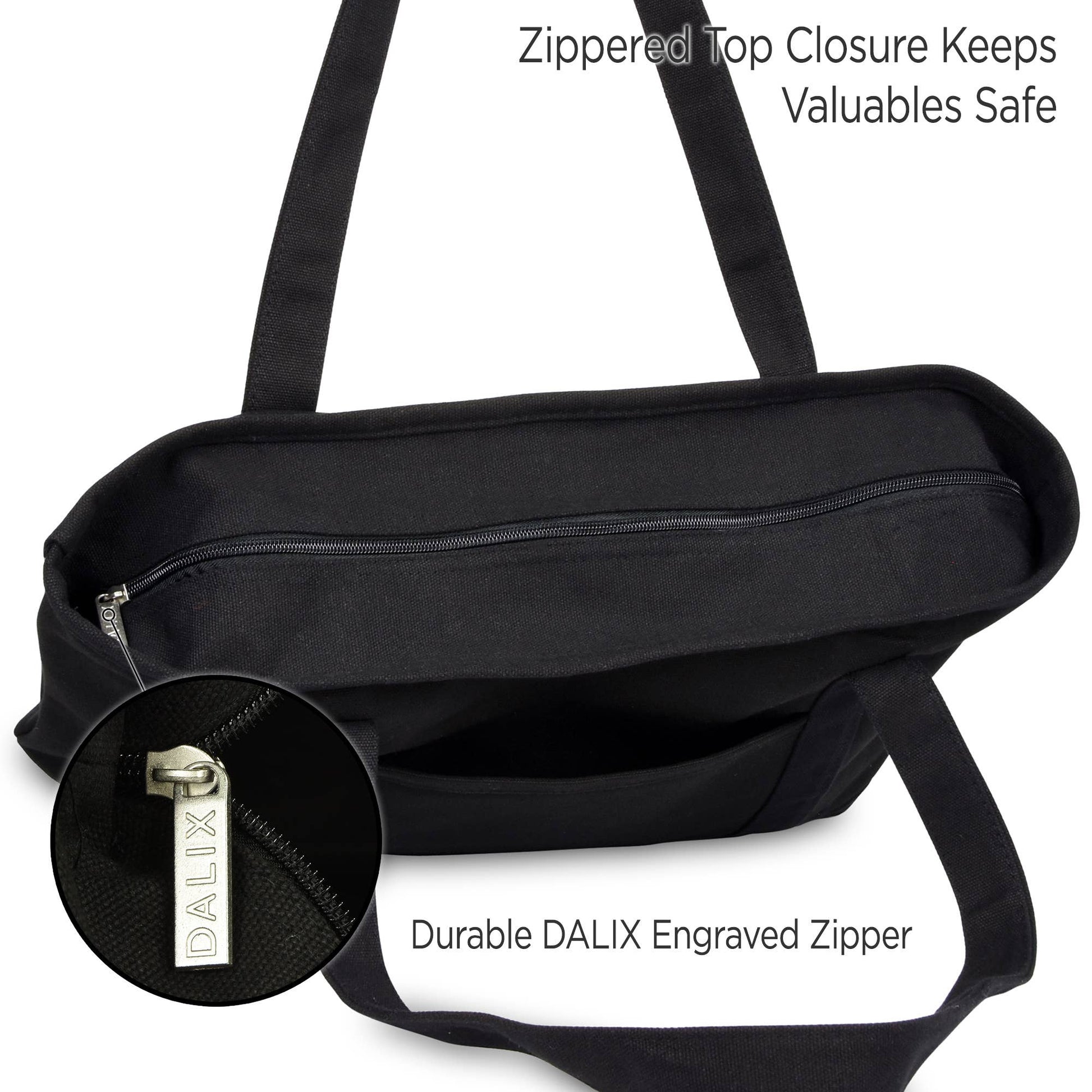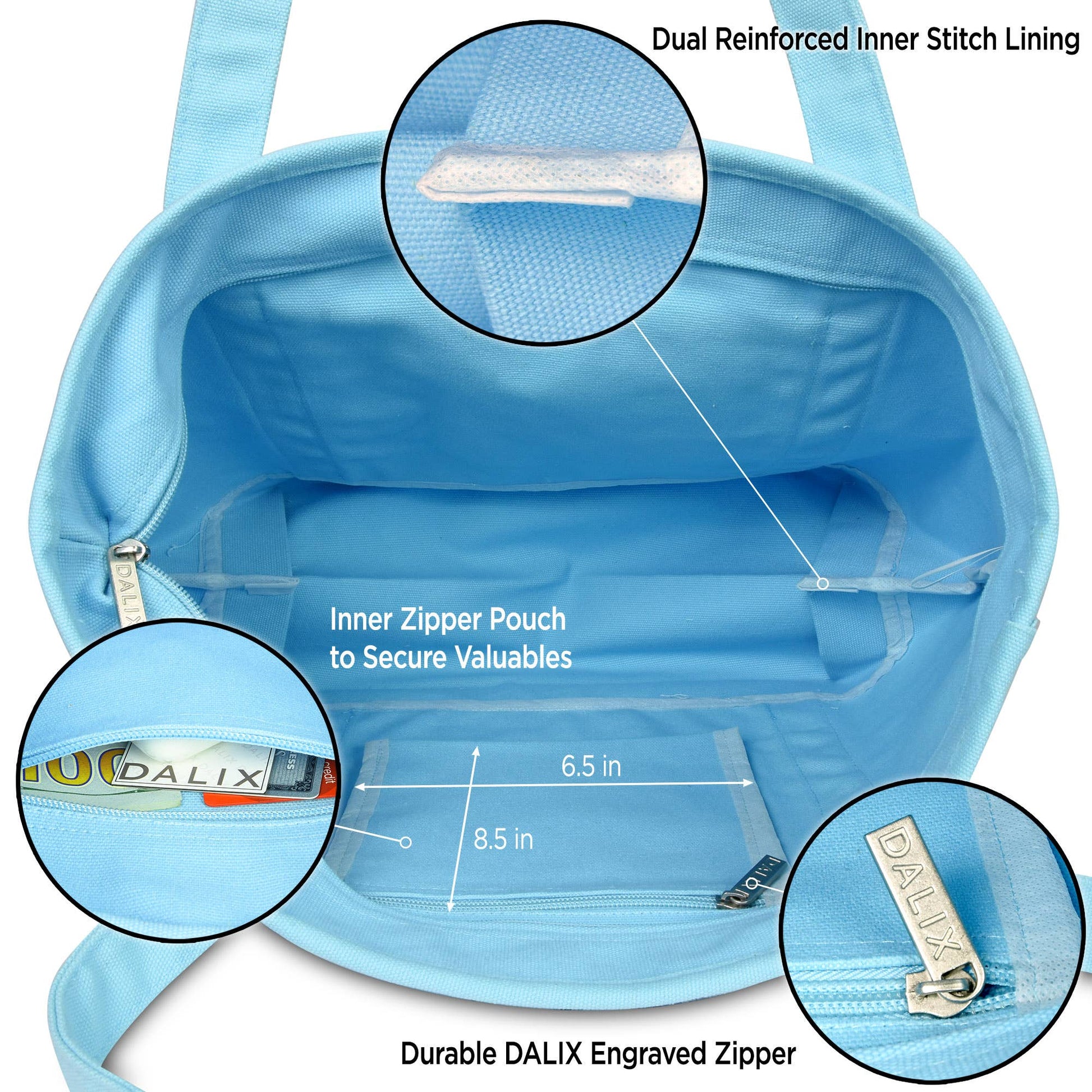 With this bag, we kept in mind the style of a classic canvas tote and mixed vibrant fun colors into it to give an edge to your outings. Made with 18 oz. premium cotton canvas, this tote bag is soft and durable for your everyday adventures. With its 11 inch soft strap handles, it allows for a comfortable carry and can opt as a daily shoulder bag or grocery tote. The main compartment is generous in space (20 inches Length x 14 inch Height x 6 Inch Depth) for you to fit all your groceries or even multiple sets of clothing for travels. On the inside, features a zippered pocket (8.5 inches Width x 6.5 inches Height) for valuables and smaller items. Both the main compartment and inner pocket features custom deluxe DALIX zippers to keep your items secured safely. Located in front is a large outer pocket (8 inches Width x 8 inches Height) for grab-and-go necessity items. Add it to your daily bag collection and use this on any occasion for work, classroom folders and books.
