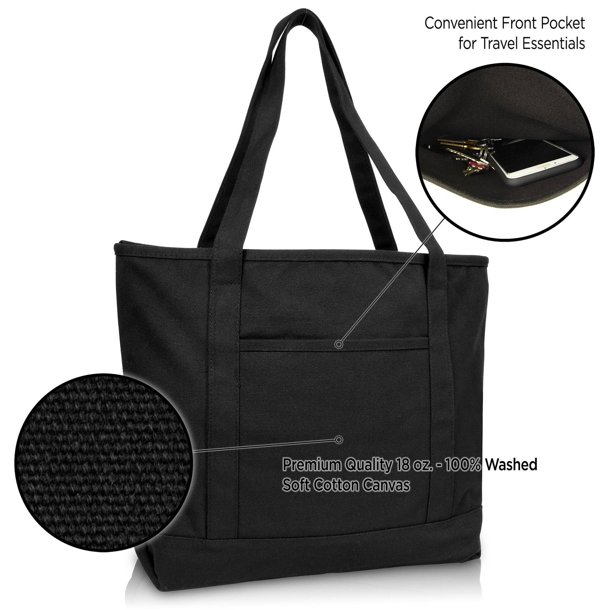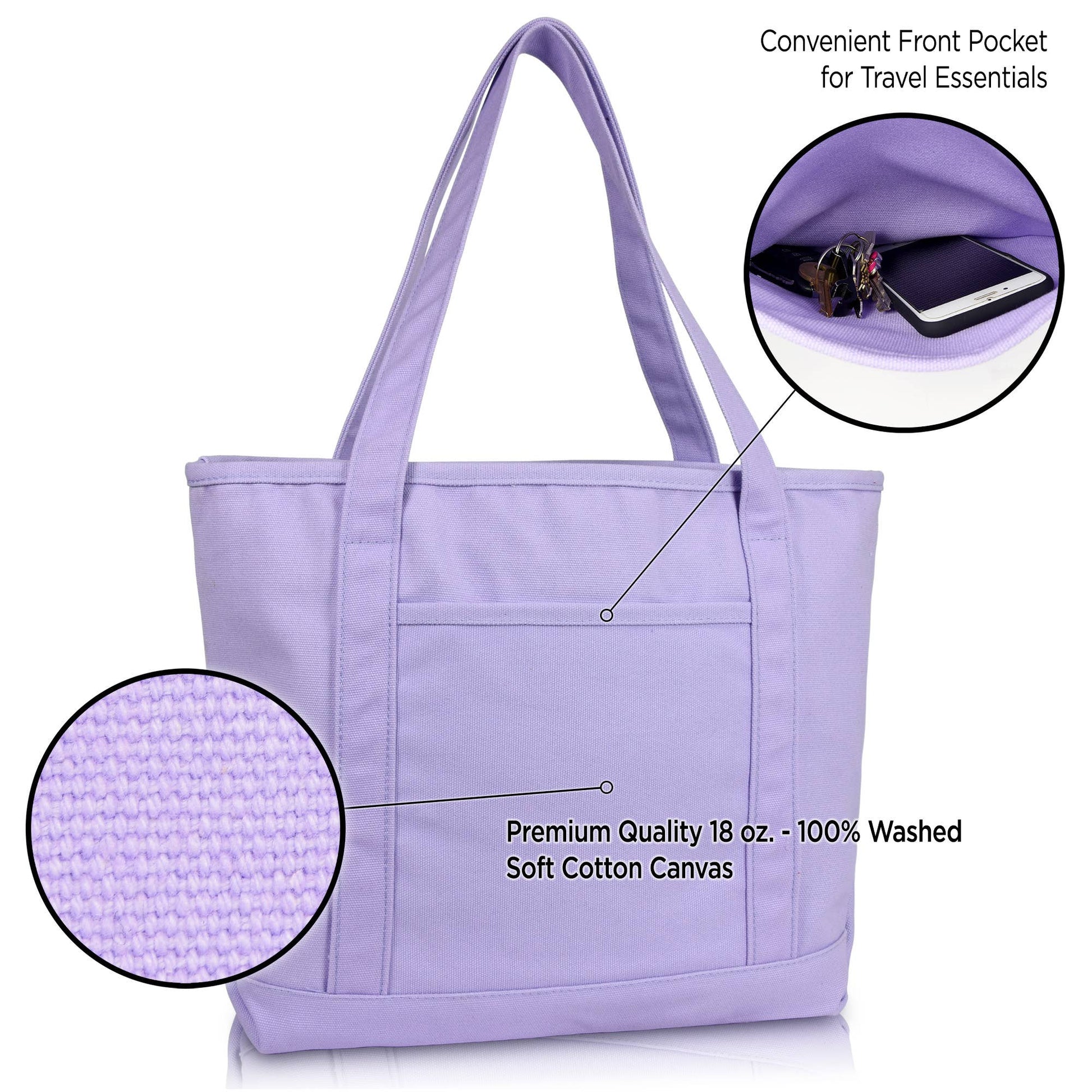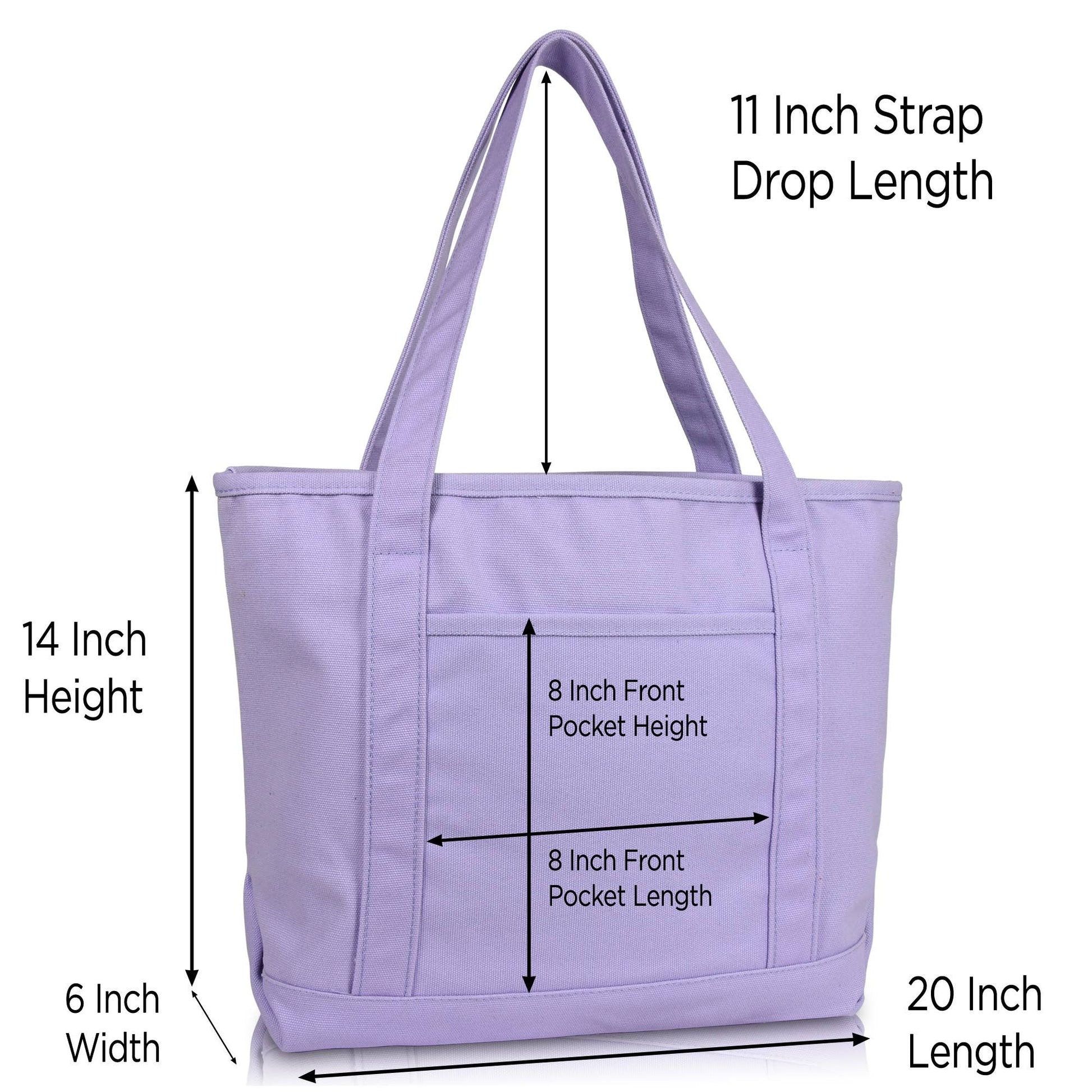 With this bag, we kept in mind the style of a classic canvas tote and mixed vibrant fun colors into it to give an edge to your outings. Made with 18 oz. premium cotton canvas, this tote bag is soft and durable for your everyday adventures. With its 11 inch soft strap handles, it allows for a comfortable carry and can opt as a daily shoulder bag or grocery tote. The main compartment is generous in space (20 inches Length x 14 inch Height x 6 Inch Depth) for you to fit all your groceries or even multiple sets of clothing for travels. On the inside, features a zippered pocket (8.5 inches Width x 6.5 inches Height) for valuables and smaller items. Both the main compartment and inner pocket features custom deluxe DALIX zippers to keep your items secured safely. Located in front is a large outer pocket (8 inches Width x 8 inches Height) for grab-and-go necessity items. Add it to your daily bag collection and use this on any occasion for work, classroom folders and books.