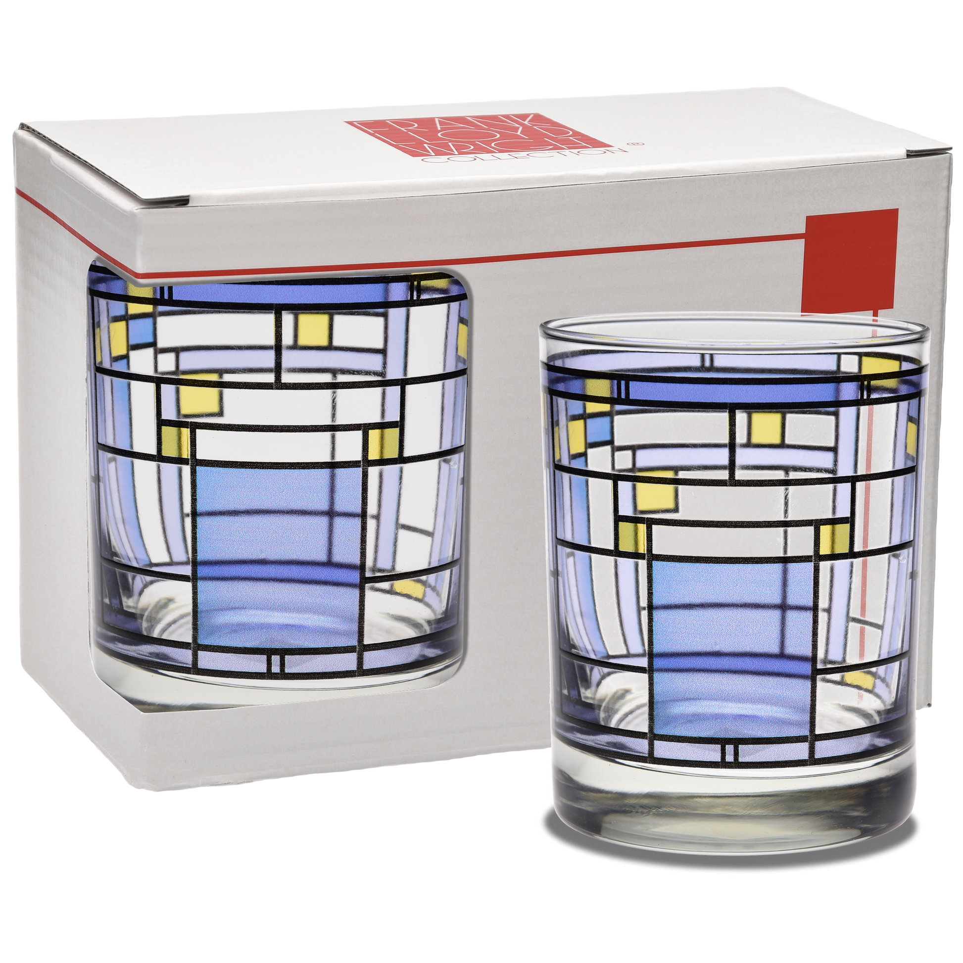 Frank Lloyd Wright Oak Park Blue DOF 14-Ounce Glass (Set of 2 In Retail Window Box) In 1889, rank Lloyd Wright built his home in Oak Park, Illinois. The complex rectilinear designs are adapted from the art glass skylights at the entrance to Wright’s two-story octagonal studio. The coloration of the glass throughout the house changes with seasonal shifts and altered qualities of sunlight. The ambiance of these spaces is just as remarkable today as it was when first-time clients visited at the dawn of the twentieth century. The environment proved to be inspiring for the architecturally formative years of Wright, he designed roughly 250 projects during his time working in This Oak Park home.