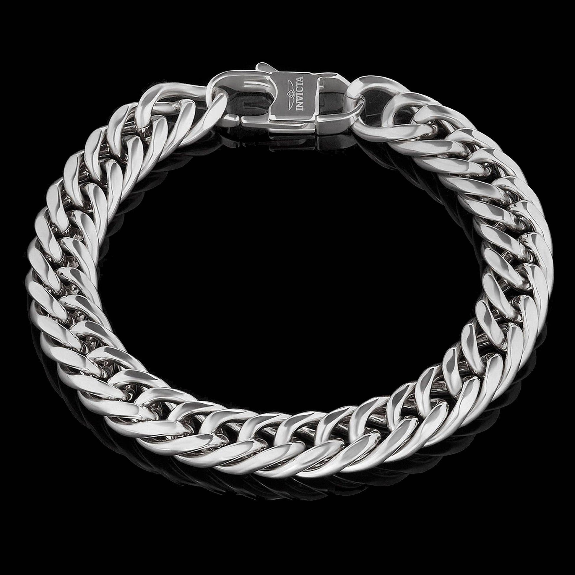 Make any look bold and stylish when wearing this Invicta Jewelry Men's Double Curb Steel Chain Bracelet. The chain features a unique design in which each curb link is linked to every other link, creating a double curb link design. The polished 8.75 inch curb bracelet has a width of 11.5 millimeters and a thickness of 5 millimeters. The chain fastens with a large lobster clasp. The solid links of give this curb bracelet a total weight of 49 grams.
