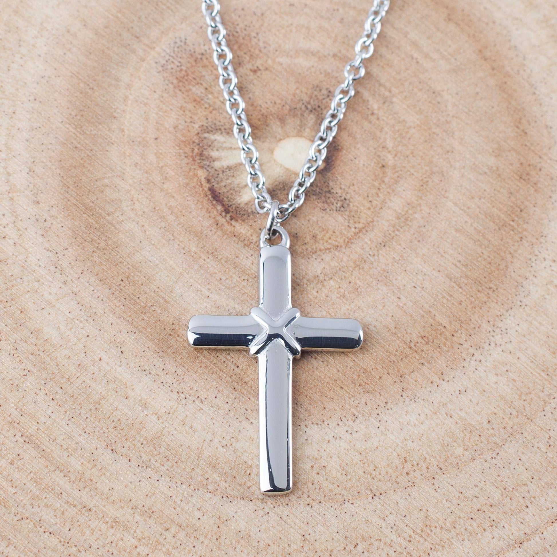 The cross hangs on a 24 inch chain and fastens with a lobster claw clasp.