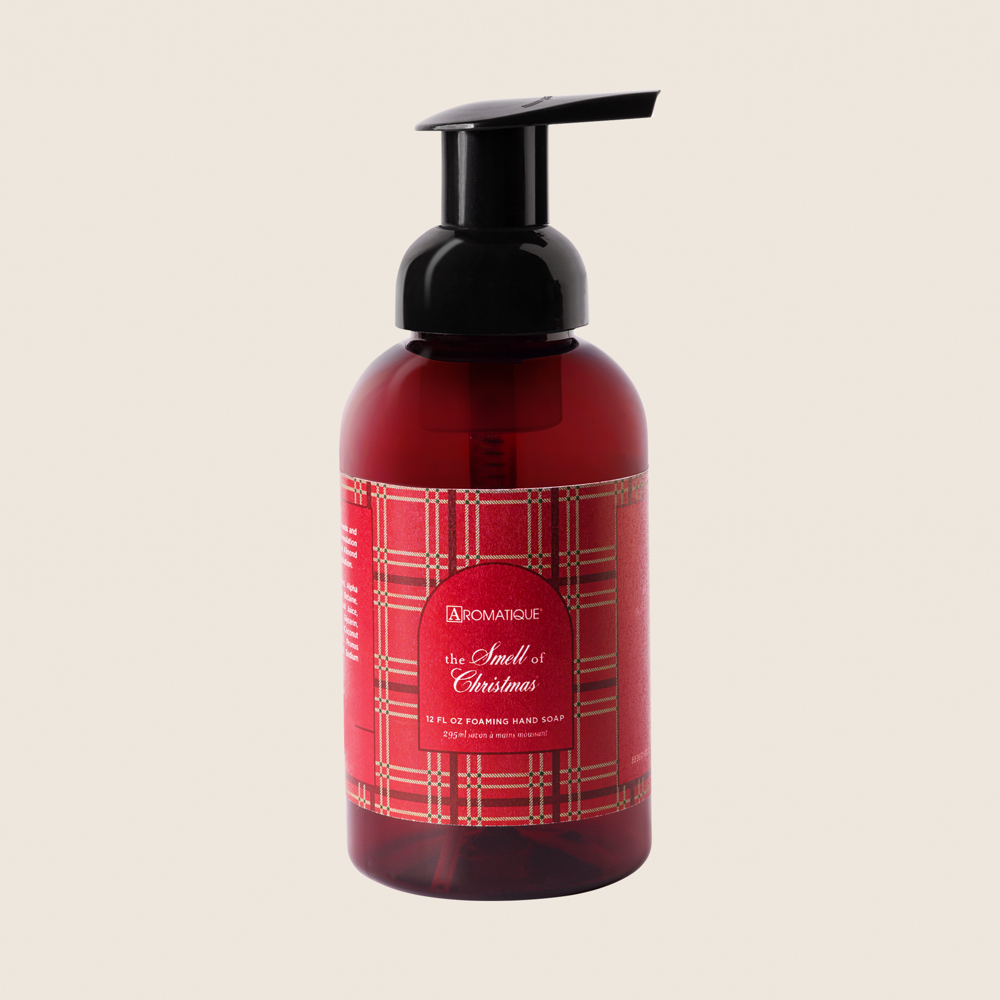 Celebrate the season with every wash. The Smell of Christmas® Foaming Hand Soap is infused with our signature fragrance—a festive blend of clove, orange, cinnamon, and warm spice. Packaged in a classic amber bottle with a black pump and plaid-inspired label, this 12 oz soap is perfect for kitchens, powder rooms, and thoughtful holiday gifting.